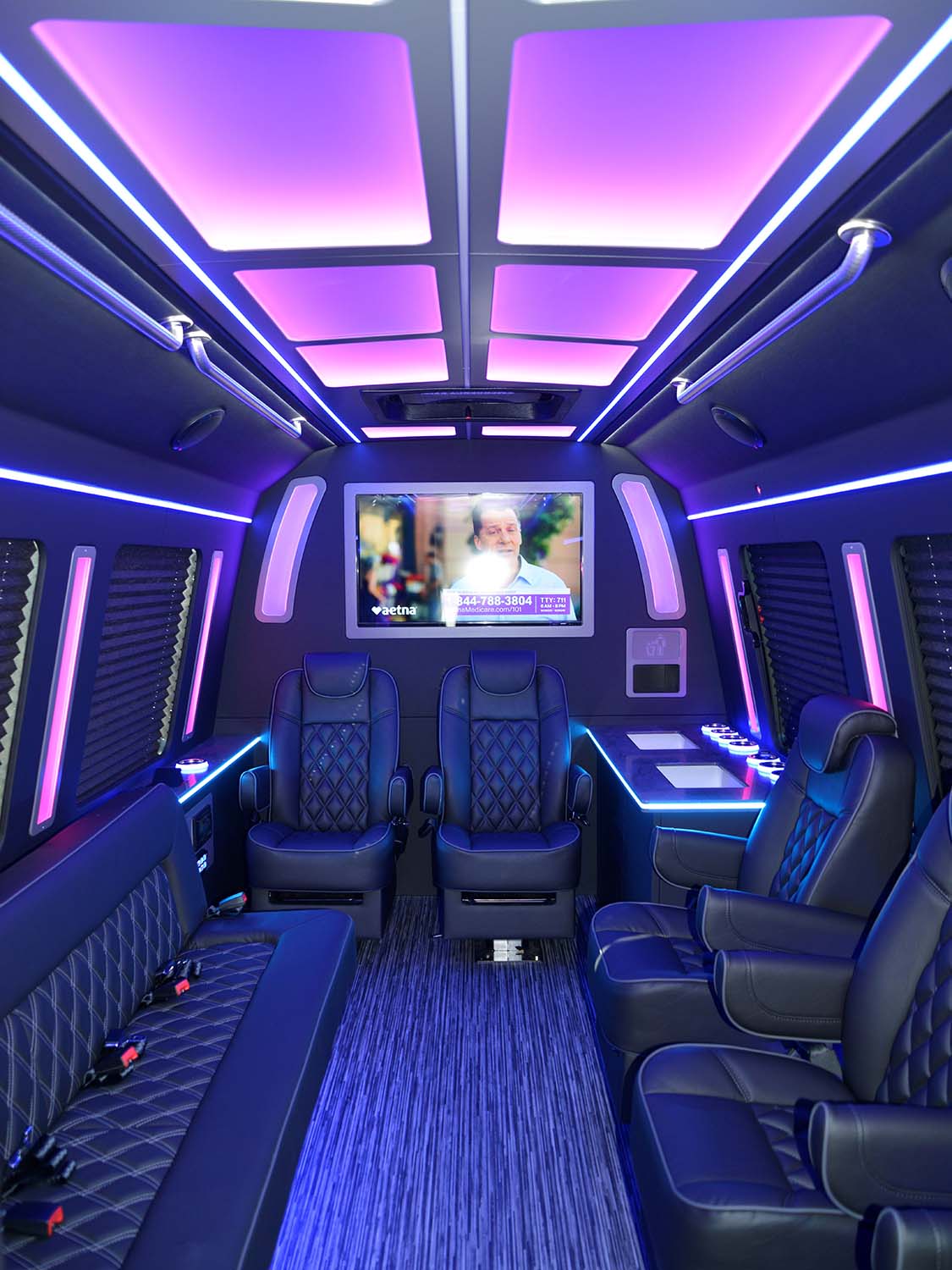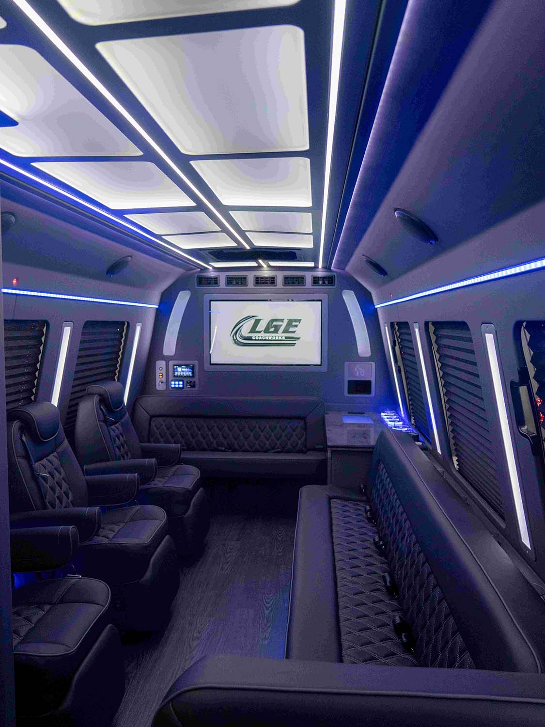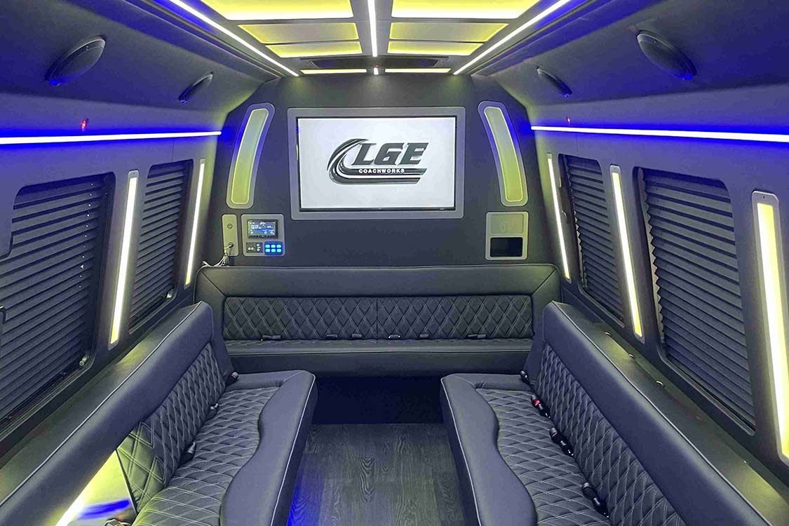 The Luxury Coach layout in this Ford E450 is built for premium executive and leisure travel. Featuring plush captain’s chairs and quilted benches, this design creates a perfect balance between individual comfort and group seating. With ample legroom, integrated workstations, and a rear bench for additional guests, the layout supports both productivity and relaxation. LED accent lighting, a high-end ceiling design, and optional onboard amenities like a restroom and galley enhance the VIP experience. Ideal for corporate groups, entertainers, or private luxury travel.