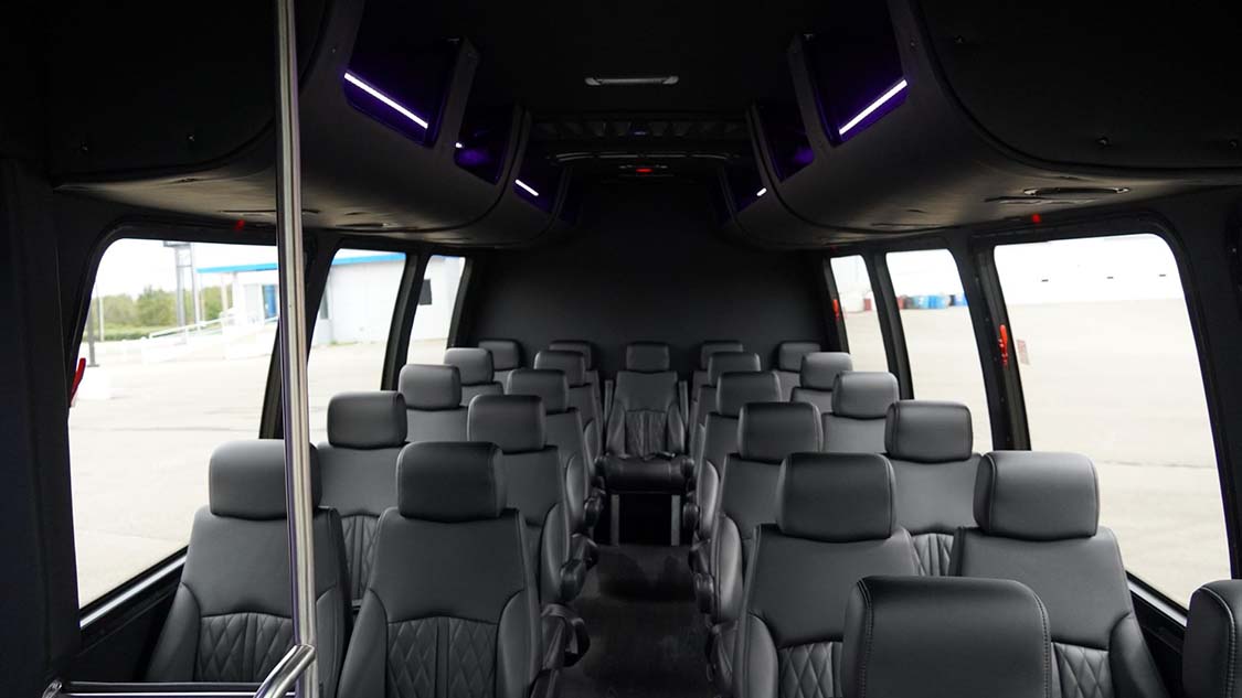 The Executive Shuttle layout is designed for first-class group transport, featuring individual high-back leather seats with armrests arranged in forward-facing rows. Ideal for corporate travel, airport transfers, or VIP events, this layout provides a professional yet upscale feel. With optional overhead luggage, subtle ambient lighting, and clean interior lines create a refined cabin experience. With room for up to 25 passengers including driver & co-pilot, it delivers the perfect blend of comfort, capacity, and elegance for passengers who expect more than a typical shuttle ride.